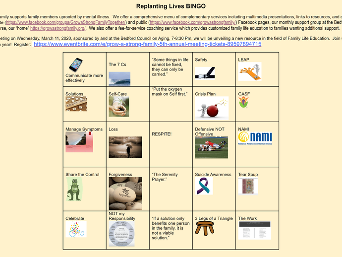 Our 5th Annual Meeting and BINGO FUN! Grow a Strong Family’s Annual Meeting on Wednesday, March 11, 2020, 7-8:30 PM, sponsored by the...